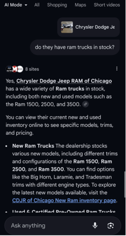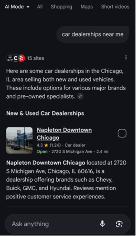 AI Mode gives dealerships multiple ways to connect with shoppers. Instead of basic listings, search results for “dealerships near me” produce rich summaries that include key details and reviews. They can compare multiple dealers at once and dive deeper by asking the AI specific questions about amenities, ratings, and more.