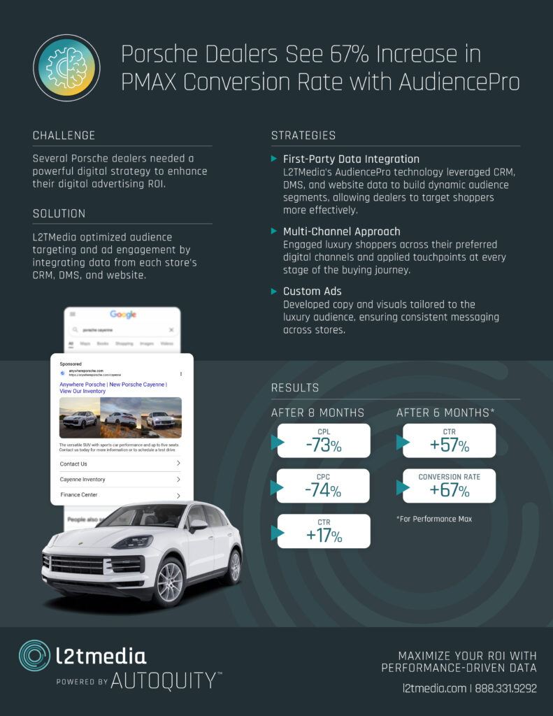 See how AudiencePro helped our Porsche dealers achieve a 67% increase in PMAX conversion rates and more: