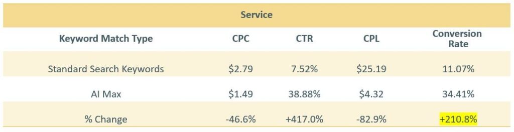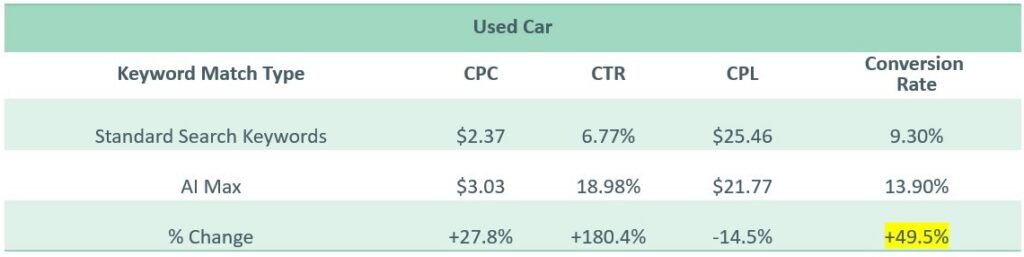 Across Model, Used, and Service campaigns, AI Max drove incremental conversions, a clear sign it’s reaching the right shoppers at the right time.